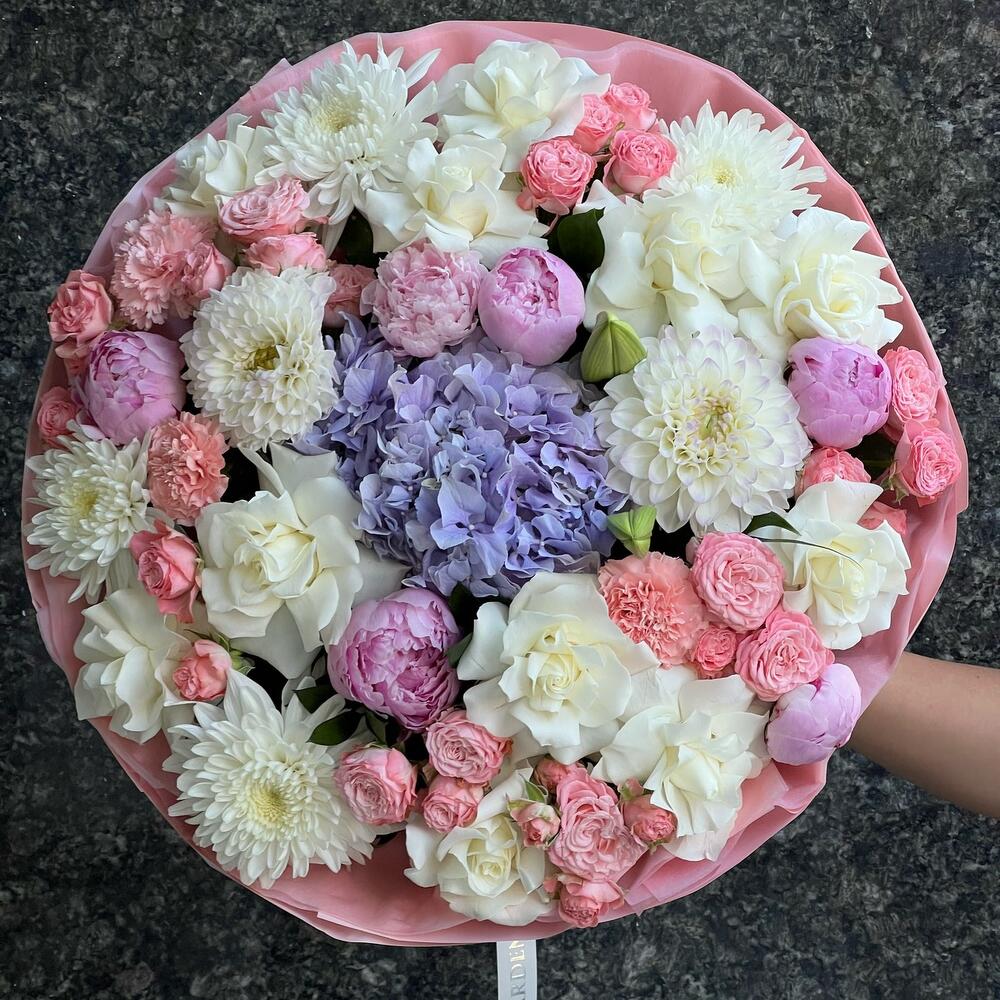 Гортензия – 1 шт. Пион Сара Бернар – 6 шт. Роза – 11 шт. спрей пионовидная роза – 7 шт. георгины – 2 шт. Хризантема одноголовая – 4 шт. Рускус – 5 шт. бумага дизайнерская – 1 шт. Диантус – 3 шт. Лилия – 1 шт.
