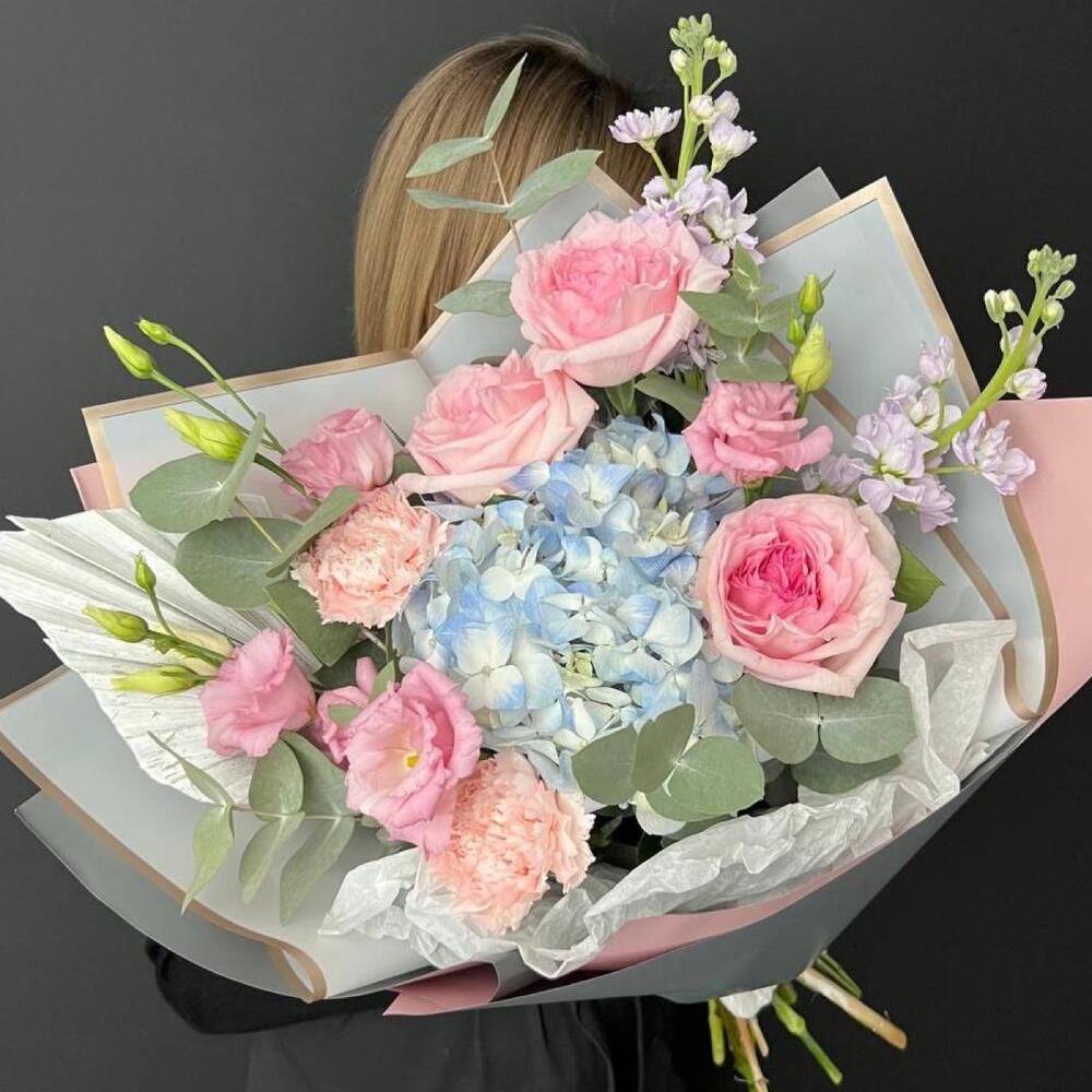 Гортензия – 1 шт.Лизиантус – 2 шт.Маттиола – 2 шт.Эвкалипт – 2 шт.Диантус – 2 шт.Роза пионовидная – 3 шт.Упаковка дизайнерская – 3 шт.Лист пальмы – 1 шт.