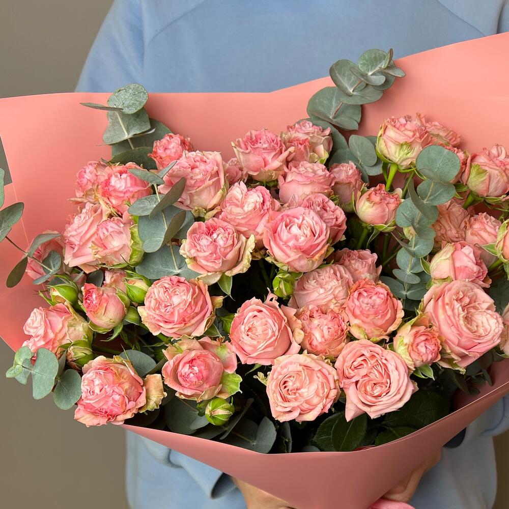 Эвкалипт – 3 шт.Упаковка дизайнерская – 1 шт.Пионовидная кустовая роза – 9 шт.комплимент от polyanka – 1 шт.
