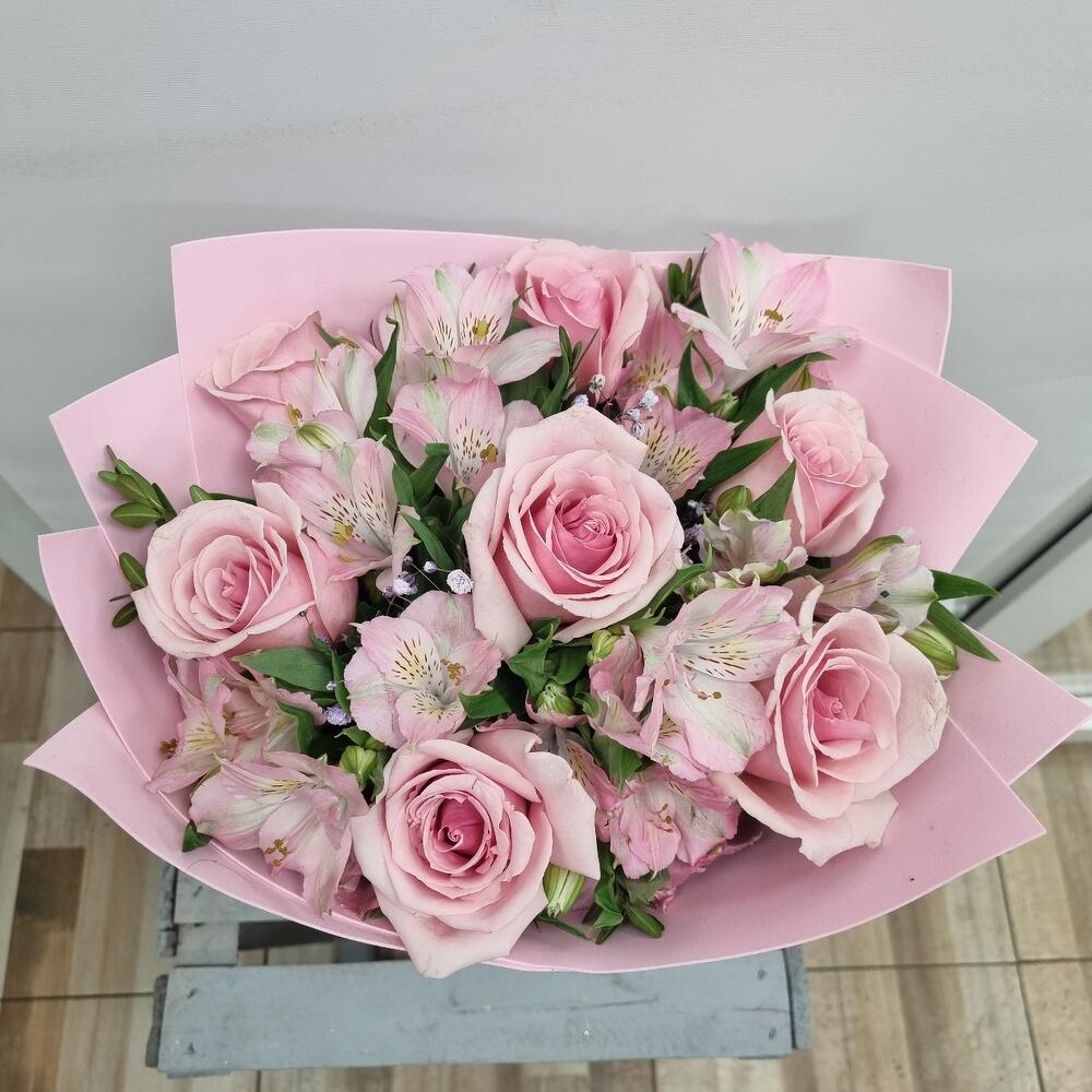 Роза – 7 шт.Альстромерия – 5 шт.Гипсофила – 1 шт.самшит зелень – 3 шт.Пленка матовая – 1 шт.
