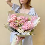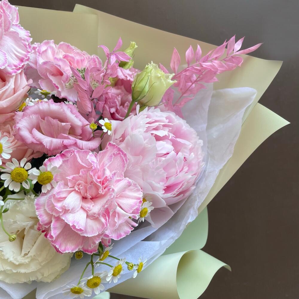 Танацетум – 2 шт.Диантус – 3 шт.Роза кустовая пионовидная – 1 шт.Пион Сара Бернар – 1 шт.Упаковка дизайнерская – 1 шт.Астранция – 2 шт.Лизиантус розовый – 2 шт.рускус стабилизированный – 1 шт.