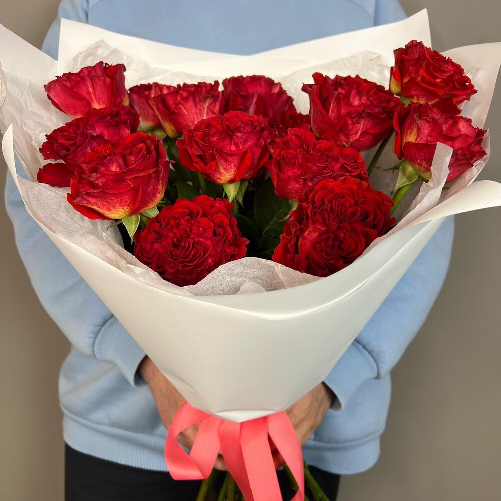 Вывернутые бархатные алые розы в белоснежной упаковке