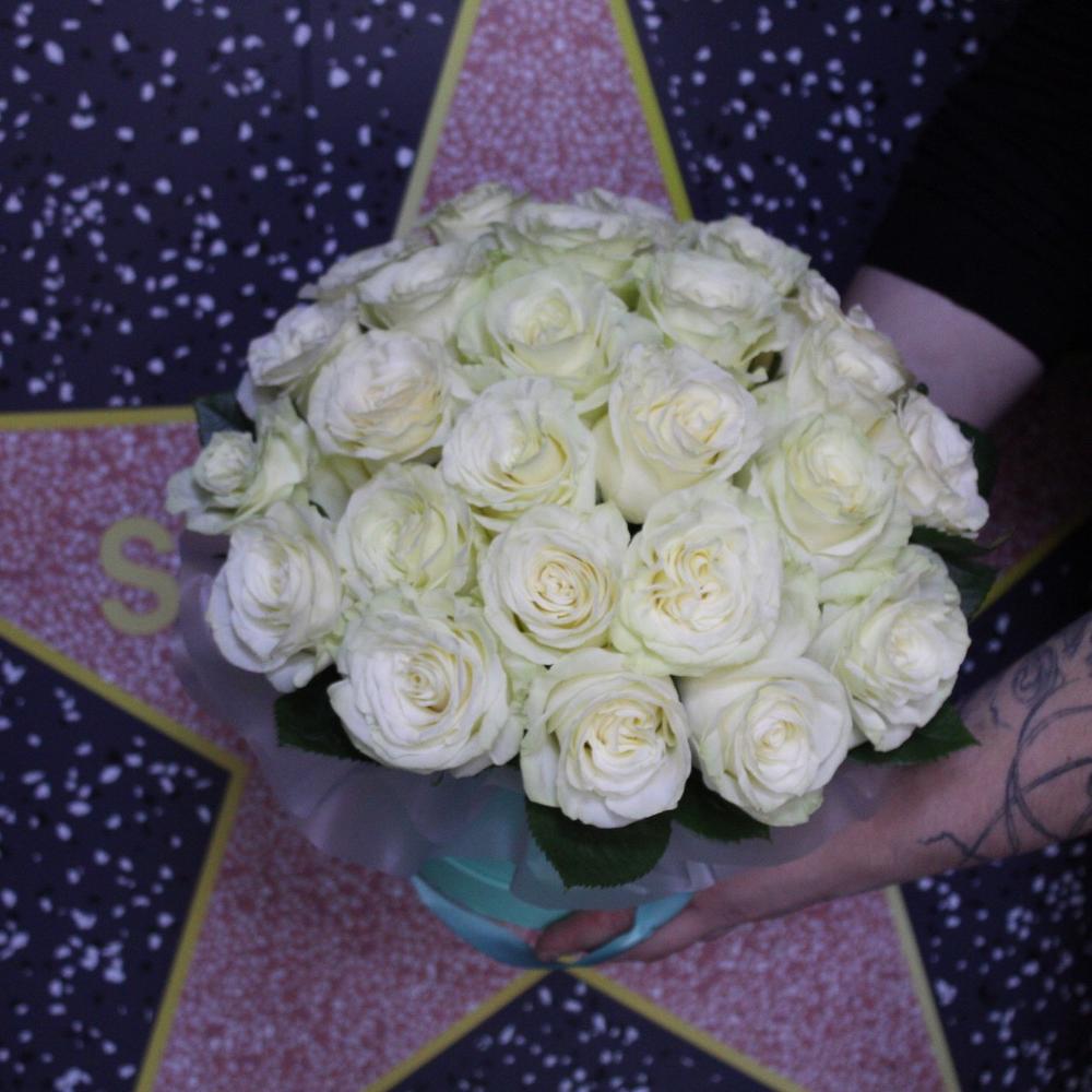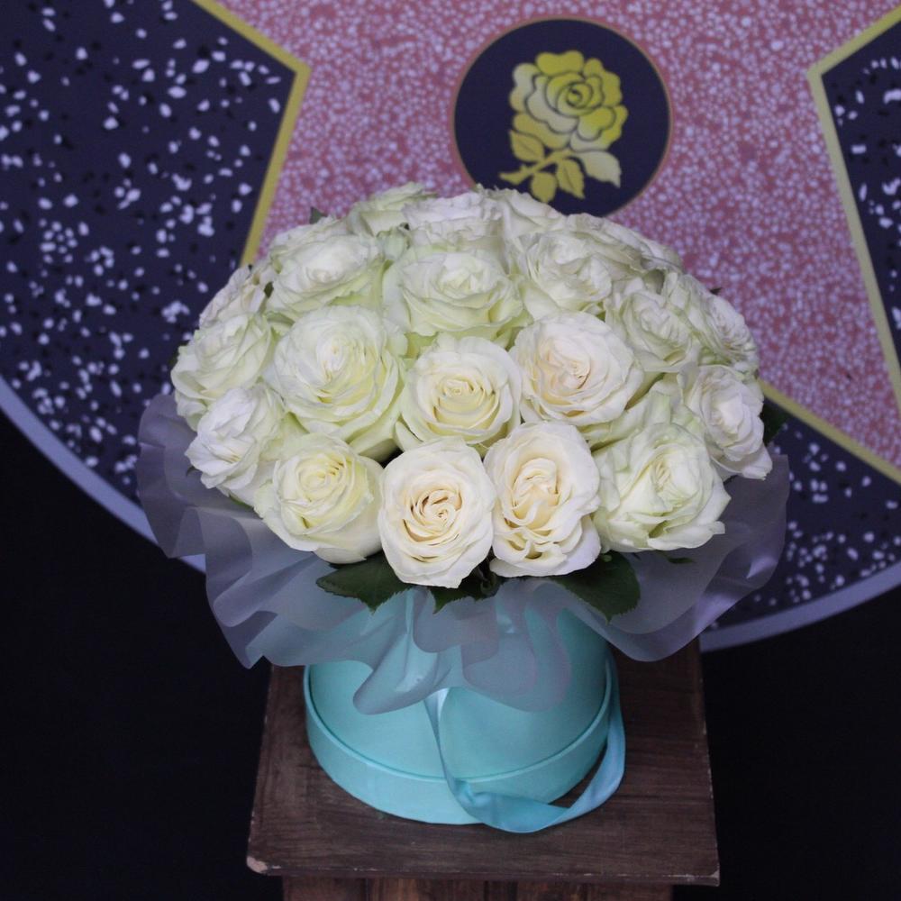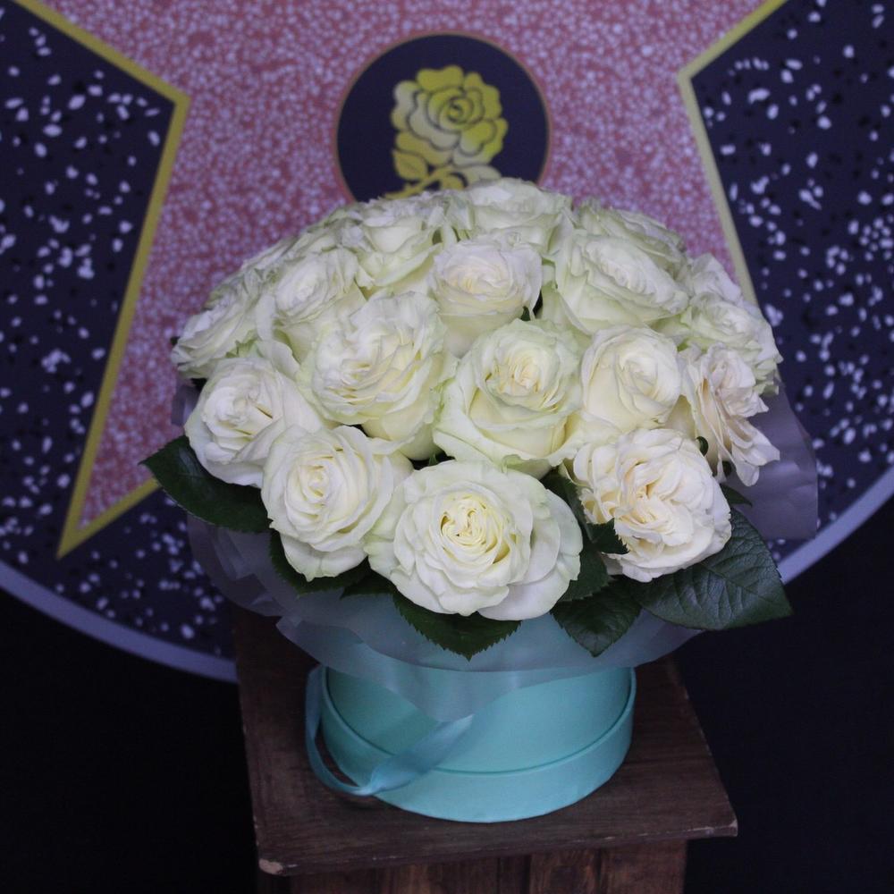 Роза Мондиаль – 25 шт.Пленка дизайнерская – 2 шт.Оазис флористический – 1 шт.Коробка шляпная – 1 шт.