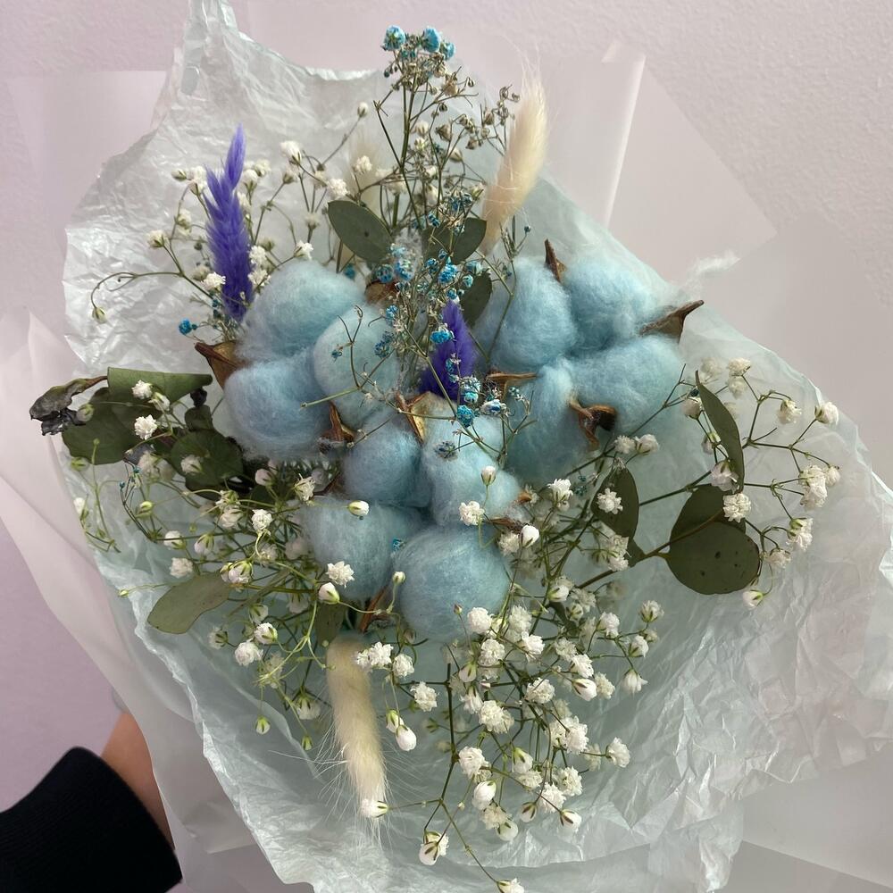 Хлопок – 3 шт.Лагурус – 3 шт.Эвкалипт – 1 шт.Гипсофила – 2 шт.Авторская упаковка – 1 шт.Открыточка с вашими пожеланиями – 1 шт.
