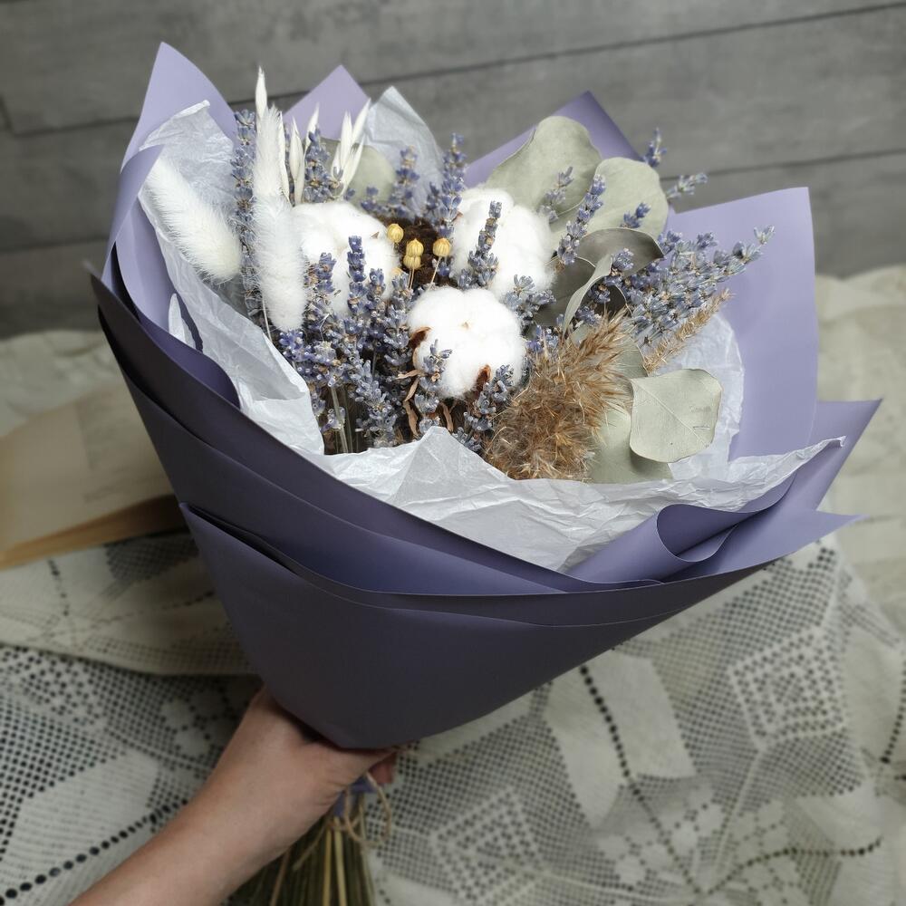 «Лавандовое созвездие» Букет из розы, гвоздики, статица и хлопка